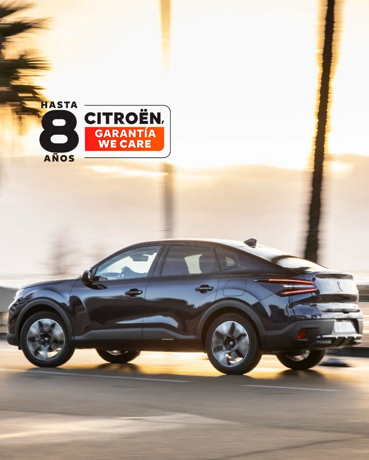 - Garantía Citroën We Care: ofrece una extensión de garantía de 6 años con una cobertura especial una vez finalizada la garantía estándar del fabricante. Se activa al realizar el mantenimiento en la red autorizada de Citroën siguiendo el plan de mantenimiento recomendado, y mantiene su validez hasta la siguiente revisión, hasta un máximo de 8 años o 160.000 km. Este servicio exclusivo cubre componentes esenciales como el motor, la caja de cambios, la transmisión y el sistema de propulsión, para todos los vehículos nuevos matriculados a partir del 10 de enero de 2025. Citroën We Care refleja el compromiso de Citroën con la calidad y la fiabilidad.